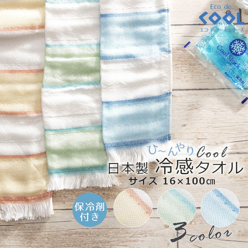 日本製 冷感タオル 100cm マフラー 冷却 ひんやり クールタオル おしゃれ スポーツタオル かわいい接触冷感クールマフラー エコデクール 16×100cmグリーン オレンジ ブルー ボーダー 熱中症対策 野外 アウトドア